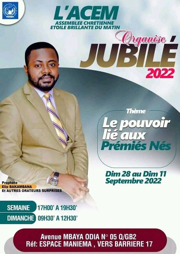 Dans un communiqué rendu ce mardi 16 août, dont la rédaction de yaelnews.net s’est procuré d’une copie, l’Assemblée Chrétienne Étoile Brillante du Matin (ACEM ), organise un séminaire dénommé » JUBILÉ 2022″, avec thème » le pouvoir lié aux premiers nés, du 28 août au 11 septembre prochain.