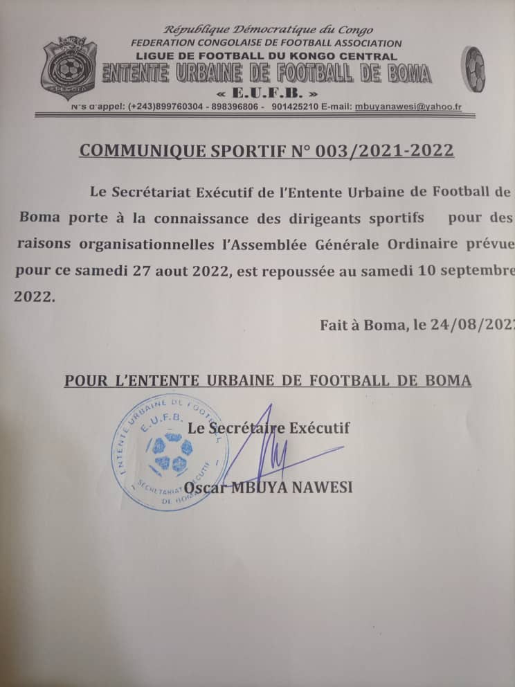 Dans  un communiqué sportif n°003/2021-2022 , rendu public ce jeudimanche 25 août,  dont la rédaction de yaelnews.net s’est procuré d’une copie,   le secrétariat exécutif de l’entente urbaine de football de boma dans la province du Kongo central porte à la connaissance des dirigeants sportifs pour des raisons Organisationnelles l’Assemblée Générale prévue le samedi 27 août 2022 est repoussée au samedi 10 septembre 2022.