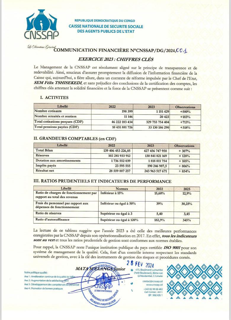 CNSSAP – FINANCES EXERCICE 2023 : DE CDF 28,5 MILLIARDS EN 2022 À CDF 243,9 MILLIARDS EN 2023, LE RÉSULTAT NET DE LA CNSSAP EXPLOSE DE PLUS DE 850%*