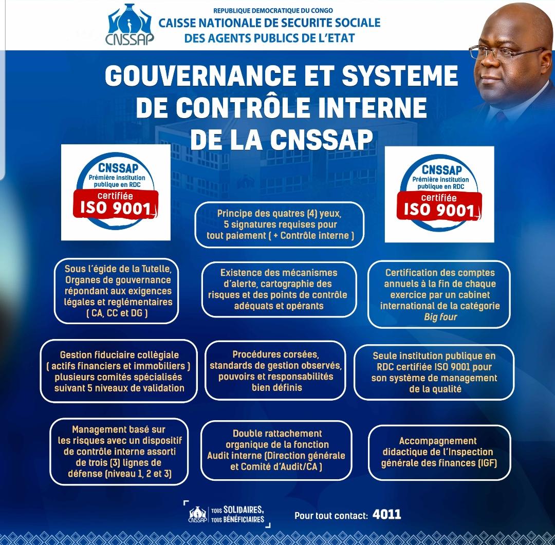 Entre-temps, notons qu’en sa qualité de la première institution publique en RDC certifiée ISO 9001 pour son système de management de la qualité, *la CNSSAP* fonctionne sur la base d’une gestion prudente et restrictive, assortie de contrôles et audits à la fois internes et externes. Cela garantit la confiance et l’assurance raisonnable quant à la maîtrise des activités, des risques et l’atteinte des objectifs. Les standards de gestion sont rigoureusement observés.