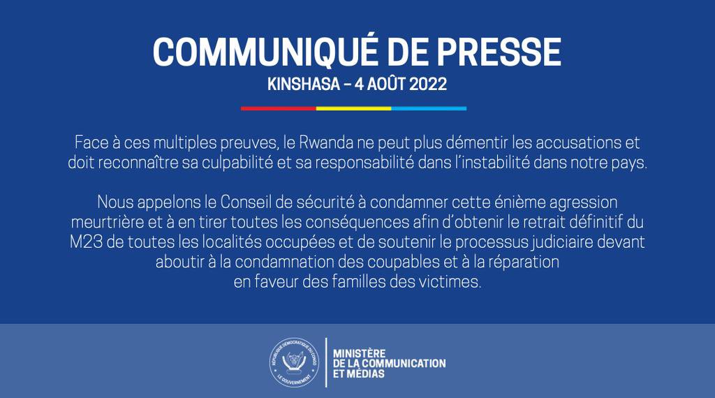 Dans un communiqué de presse rendu public ce vendredi 05 aout, dont la rédaction de yaelnews.net s’est procuré d’une copie, le ministère de la communication et médias appelle le conseil de sécurité à condamner cette énième agression meurtrière et à tirer toutes les conséquences afin d’obtenir le retrait définitif du M23 dans toutes les localités occupées et de soutenir le processus judiciaire devant aboutir à la condamnation des coupables à la réparation en faveur des familles des victimes.