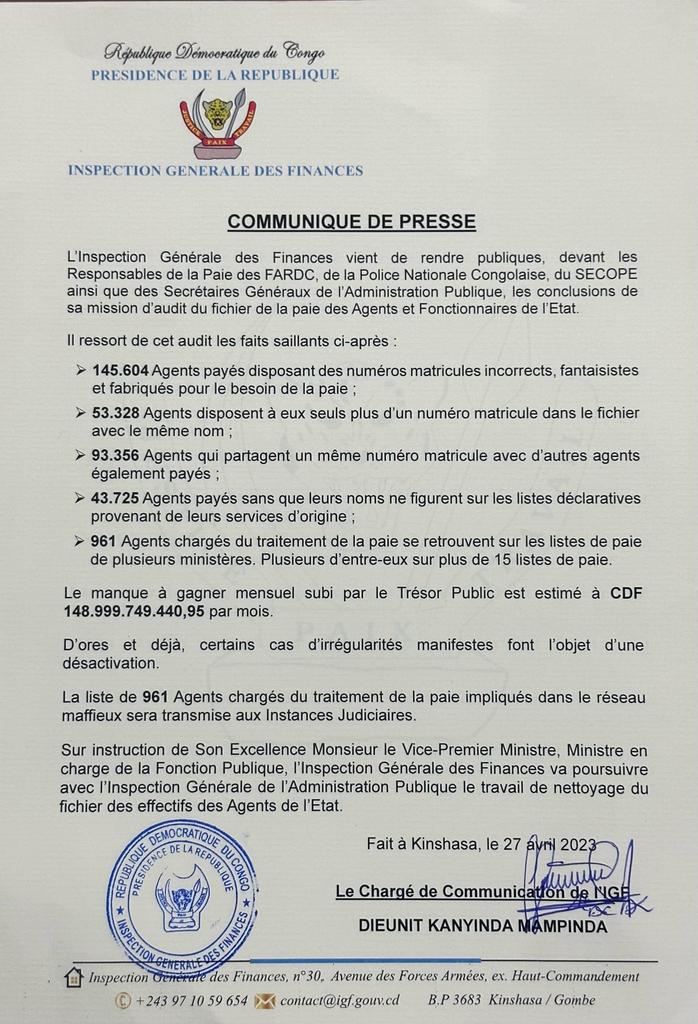 L’inspection générale des finances ( IGF ), vient de rendre en publiques devant les responsables de la paie de FRDC de la police, de la police Nationale Congolaise, du SECOPE, ainsi que des secrétaires généraux de l’administration punique les conclusions de sa maison d’audit du fichier de la paie des Agents et fonctionnaires de l’État.